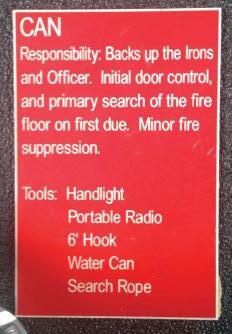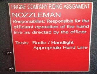 do to support the overall mission of that apparatus. This is best accomplished with riding assignment placards. Riding assignment placards have been successfully used by responsibilities and what tools they should take with them when they get off of the rig. The riding assignment placards are like brief job descriptions that ensure the crew knows the tasks for which each member is responsible. When the placards are used in trainagainst the goals stated on the placards. each seat so that they are visible and conspicuous. The hydrant as-
