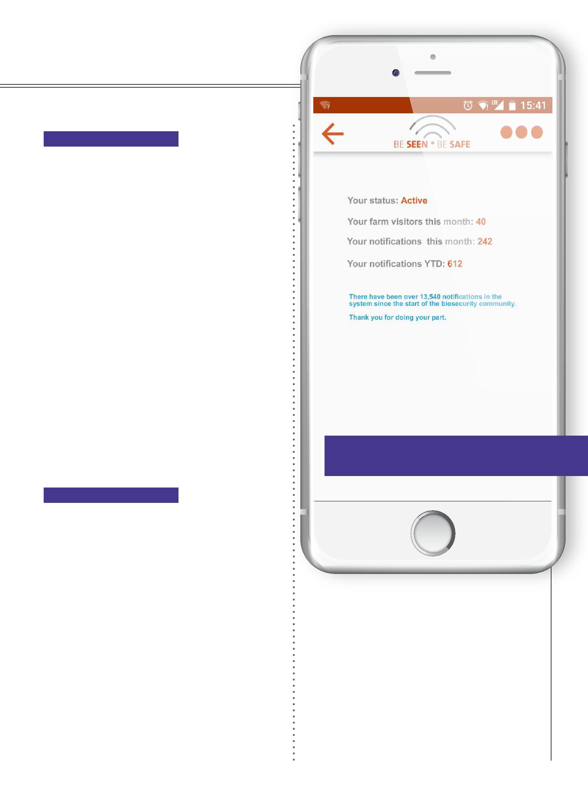 While executive director of the PIC, Tim Nelson wanted to find a more immediate solution. After several years of working with a technology partner, Nelson, now CEO of the Livestock Research Innovation Corporation (LRIC), is seeing his vision become reality. The “Be Seen Be Safe” app (see full story on page 10) acts as a virtual logbook, recording the movement of who comes on and off a farm and logging the information in a central database. During an emergency, Be Seen Be Safe can quickly analyze visitor information obtained from an infected property and plot the movement of visitors to that property throughout its infectious period, where they came from and where they went in order to identify potentially infected secondary properties.