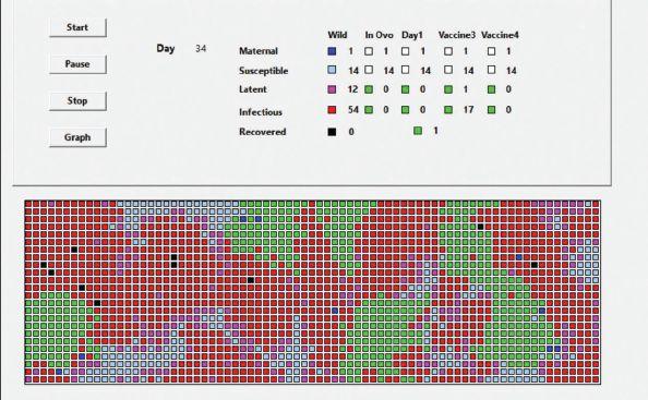 On the screen, users can see various flock simulations that show how vaccination (the act of giving vaccines) does not necessarily equate to immunization (effective vaccination). Many factors, as seen in the tool, can affect vaccination success, including quality of barn cleaning between flocks, level and uniformity of maternal antibodies within a given flock, use of different vaccine types, vaccination timing, biosecurity breaches and more, for diseases such as infectious bursal disease (Gumboro) and ILT.