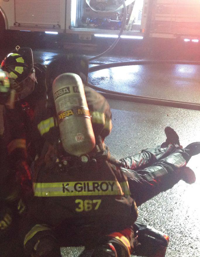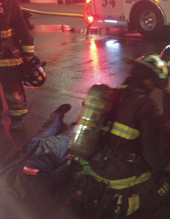 Firefighters with Comox Fire Rescue perform emergency first-aid on a down firefighter (training dummy) for a firefighter down training scenario. By integrating psychological first aid into every training situation, we are committing it into our muscle memory as a key element in our first response.