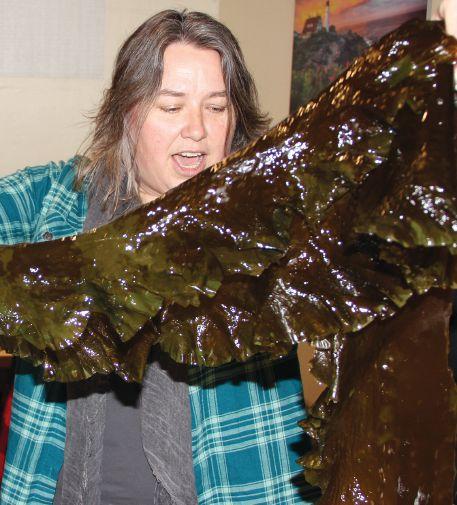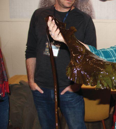 Seraphina Erhart, whose family started Maine Sea Coast Vegetables 50 years ago, shows a ribbon of wild kelp she harvested at the culinary demonstration, National Seaweed Symposium, 2023