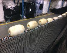 Seeded string is wound off a spool onto a line that will be suspended below the sea surface to grow kelp.