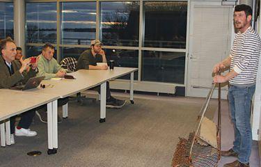 Michael Gilman shows an oyster dredge to students in the “Foundations of Shellfish Farming” class at UConn Avery Point last spring.