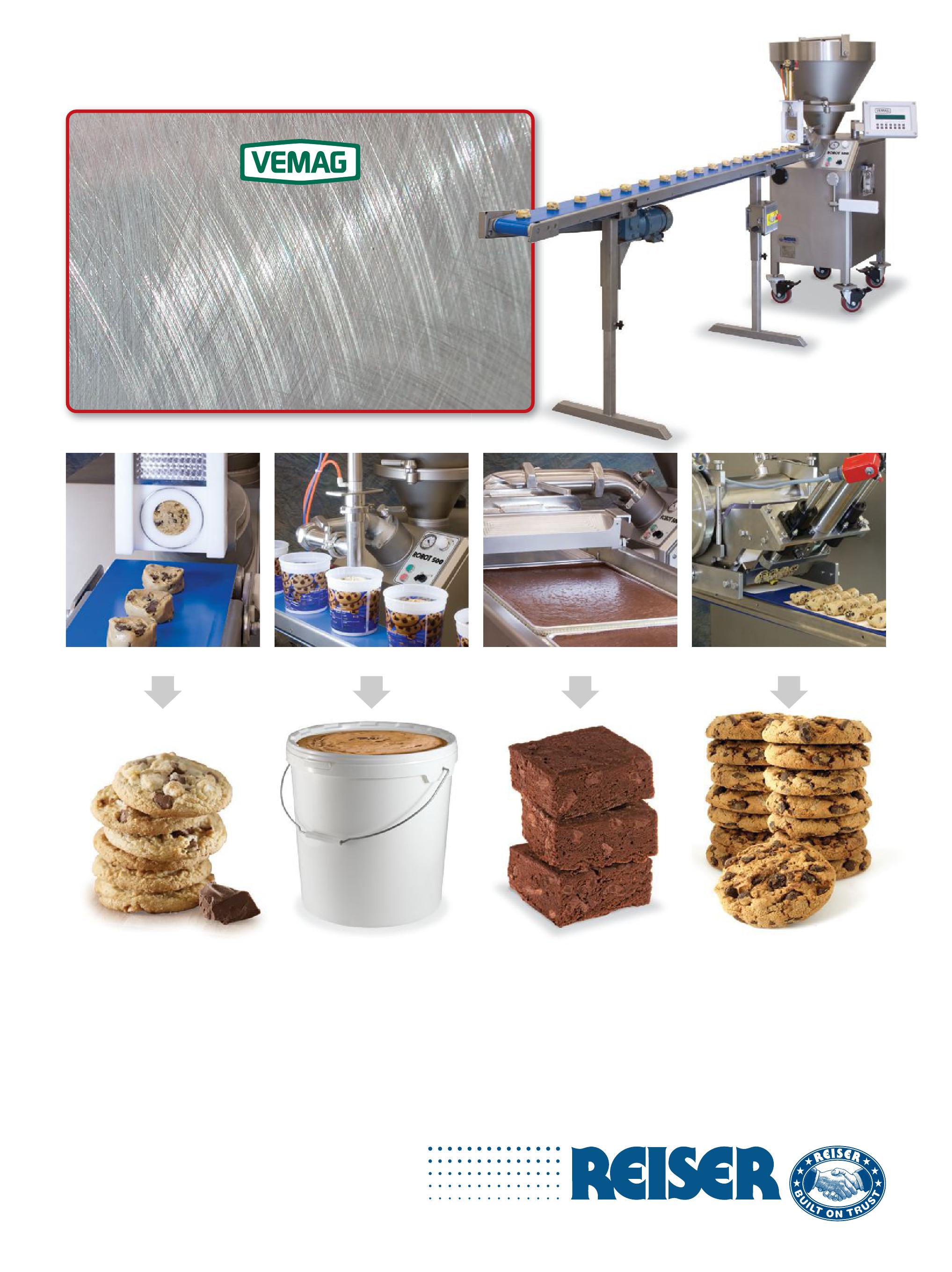 The Vemag 5 00 is an incredibly versatile machine that allows you to easily produce a wide variety of products. The Vemag incorporates a number of innovative attachments that provide you with the flexibility to not only expand your product line, but to react quickly to the ever-changing tastes of your customers Attachments can be swapped out in minutes Use a single-lane Guillotine attachment to produce individual cookie dough portions Change over to a Dripless Valve attachment and use your Vemag 500 to fill tubs with that same cookie dough, or use it to portion fillings into pie shells and tarts, or batter into pans Then change over to a Rotary Sheeter attachment to extrude smooth, uniform sheets of brownie batter And when business takes off and you need higher production volumes, use that same Vemag 500 with our Waterwheel flow divider attachment for multiple-lane production. You’ll find that the versatile Vemag offers the highest levels of portioning accuracy, speed and product quality Let us help you expand your product line and grow your business with the one and only Vemag 500