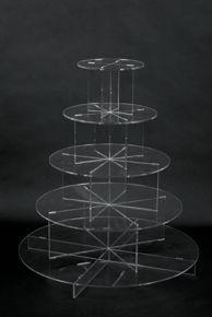 The five tier stand breaks down so each tier can be used separately or assembled to height as needed. Made of a high quality 3/16th” acrylic, each tier measures (from top to bottom) 7” /10” /13” /16” /20” and holds about 100 to 120 regular cupcakes or 210 to 215 mini cupcakes.
