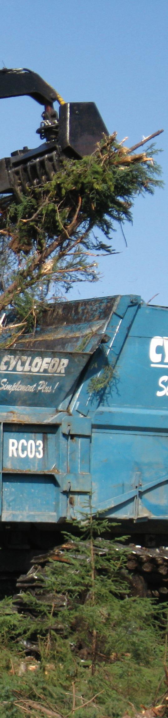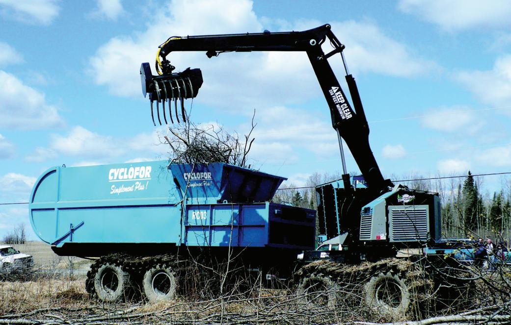 Quebec innovators Cyclofor have created an entire system to deal with the readily available harvesting slash in northwestern Quebec and northern Ontario. It includes the RC-03 slash collector-compactor, slide-off transport containers, and a unique processing plant with a custom-made debarker/sorter.