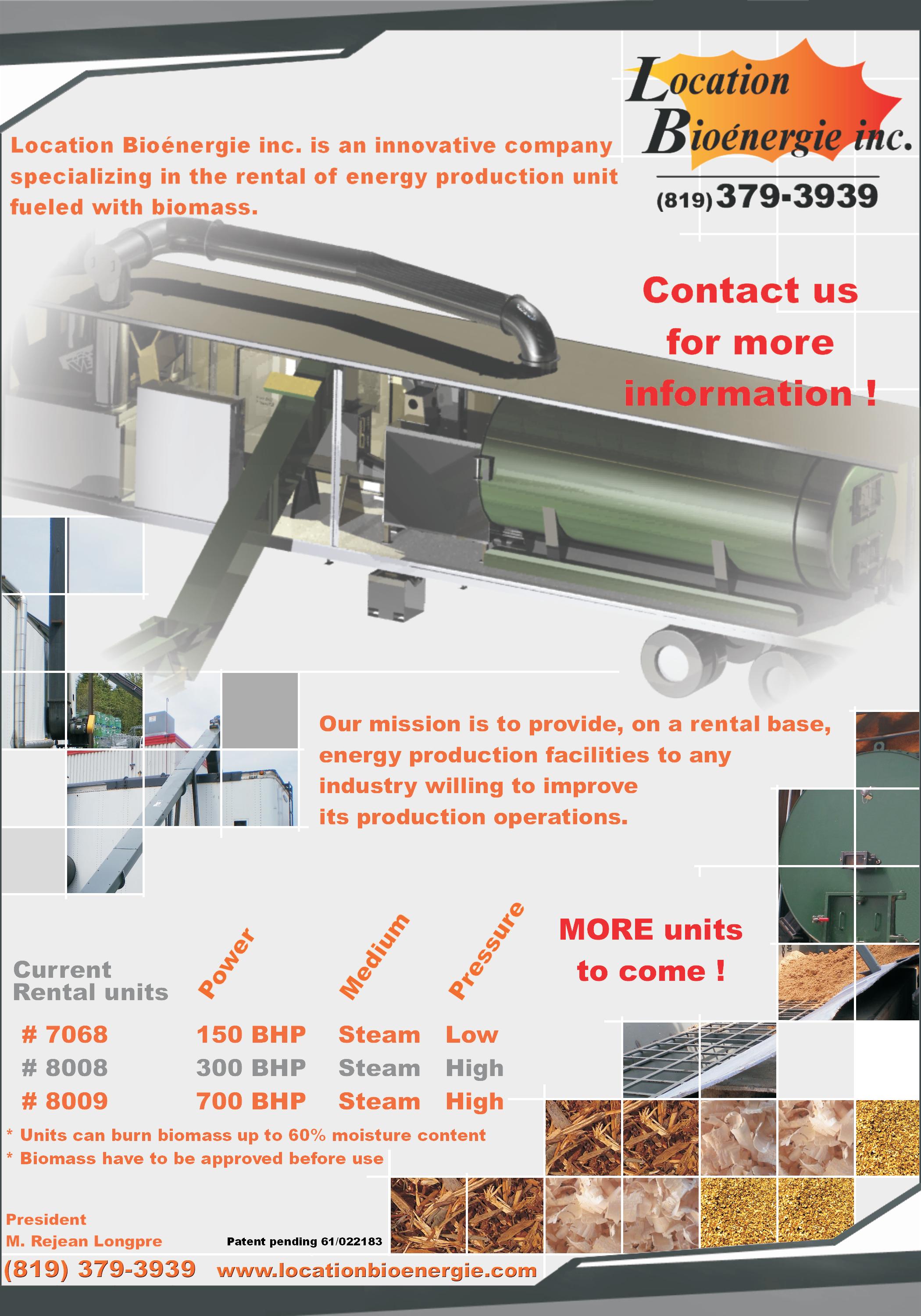 will are expected in the next year. Biomass heat and power projects in Quebec and Ontario are also on the rise. As this article went to print, a new project for a 10-megawatt CHP project was about to be announced for a pulp and paper mill in Northern Ontario, and Hydro Quebec was about to issue a highly anticipated call for 100 megawatts for power using forest biomass.