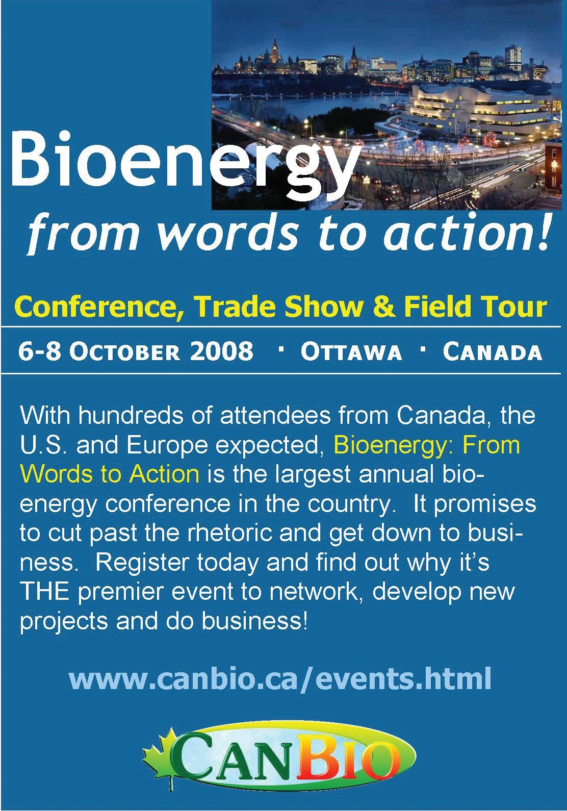 The Canadian Bioenergy Association’s annual conference is organized around creating bioenergy business opportunities. “Bioenergy: From Words to Action,” a two-day conference and one-day study tour, is taking place in Ottawa on Oct. 6-8 and promises to bring developers, investors, municipalities, entrepreneurs and industry from around the world together to develop new bioenergy projects. It’s the biggest bioenergy event in central Canada and one of the main aims is to find package solutions for communities to use biomass for energy and strengthen their economies. A trade show will showcase the latest technologies from Finland, Austria and Canada and other biomass equipment and project developers. Following the two-day conference, a field tour is planned to visit the world’s longest-running fast pyrolysis plant, (a 100 tonne-per day facility in Renfrew, ON), a biomass co-generation plant at Abitibi-Bowater’s pulp mill in Gatineau and Les Broyeurs à Bois harvest waste operation. For more on the conference, visit, www.canbio.ca/events.html.