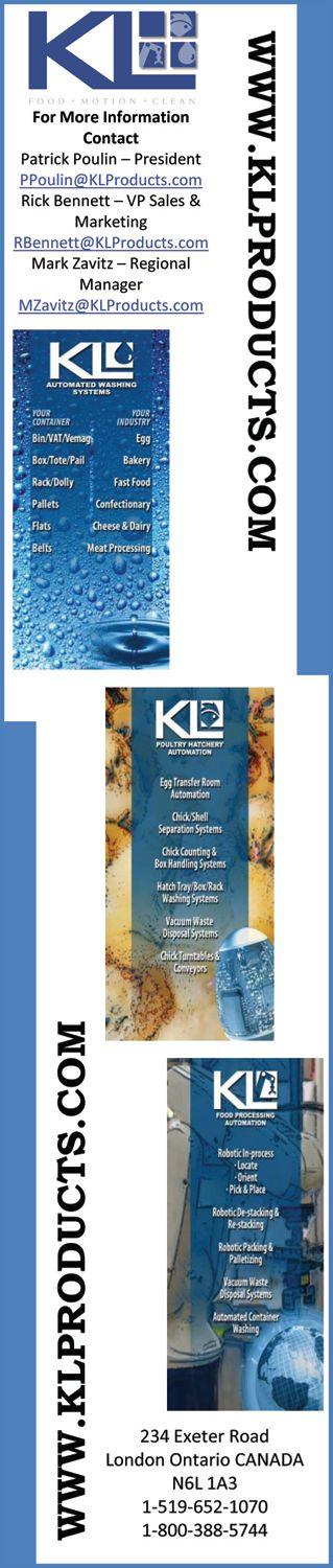 kl pRODuctS - KL is an innovator in food processing and hatchery automation providing productivity and food safety improvement using advanced robotics. In addition to our fully integrated hatchery automation systems, key areas of focus are fresh and ready-to-eat direct food handling, post weigh/price/label case packing, and palletizing. KL also manufactures a full line of industrial washers for items used throughout the food industry (totes, bins, boxes, trays, Vmegs, dollies, buggies, carts, pallets, live haul modules, and more). Learn about KL’s automation and washing systems at www. KLproducts.com.