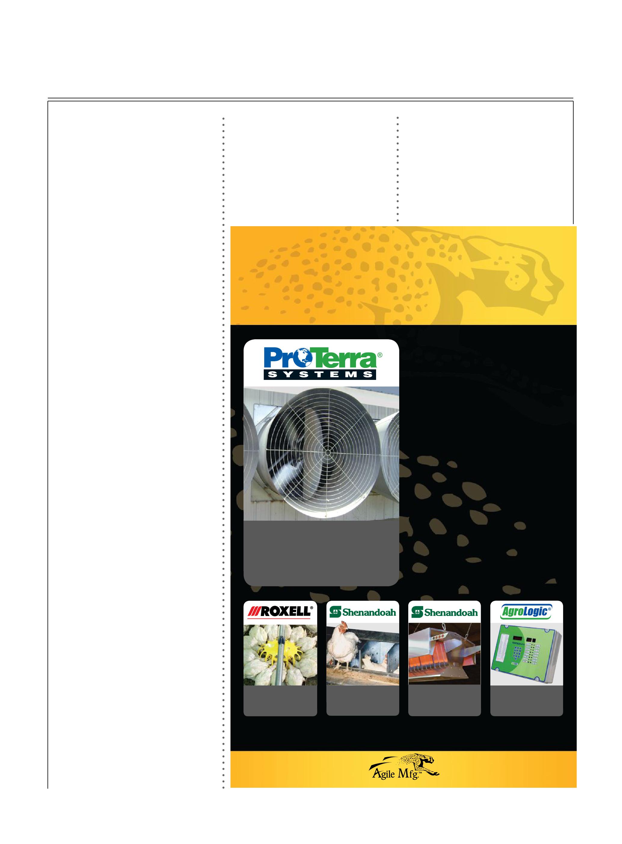 pROtERRA SYStEMS – Agile’s ProTerra® Systems line offers poultry producers a 54-inch outside-mount fan option. Able to be installed over rough openings for most 48- to 54-inch fans, the 54-inch ProTerra® Fan features the company’s BI-FLOW® Shutter to deliver up to 10% more air. In addition to ProTerra® fans, evaporative cooling, lifts and inlets, Agile Mfg., Inc. offers a complete line of equipment for poultry producers. Get ROXELL® oval feeding systems as well as drinking, storage and transport systems; SHENANDOAH® heating, nesting and incineration systems; and AGRO LOGIC® controls and scale systems. Agile offers technology designed for value, efficiency and profitability; and single source simplicity for brands you trust with local distributor support. Agile Mfg., Inc., 720 Industrial Park Road, Anderson, Missouri, U.S.A. 64831; Telephone: 417-845-6065; Fax: 417-845-6069; E-mail: sales@agilemfg.com; Web: www.agilemfg.com