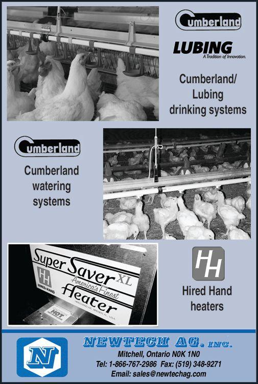NEWtEch AG. INc. - A company that supplies, installs and maintains all ventilation, feeding, heating and cages systems. Our company will keep your farm running smoothly. Our main lines include Hellmann cage systems, Cumberland feeding and watering systems, Lubing nipple systems, GSI flex augers and feed tanks, Hired Hand and PSI box heaters, Re-Verber-Ray, Brant and Superior Radiant tube-heaters, ventilation systems from Norsol, Vic Systems, Vari-fan Controls, Agri-fans, Phason and Prairie Pride. Also available are Dosatron water injectors, cameras (wireless, wired & Internet based), electronic animal, feeding and bin scales, Sensaphone and Agri-alert alarm systems. We offer full troubleshooting and repair service electronic and mechanical for any of your needs – big or small we do them all. CONTACT: 1-866-767-2986 OR email: parts@newtechag.com.