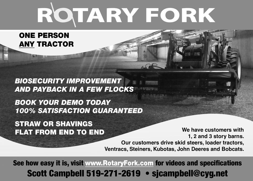 ROtARY FORk - The Rotary Fork is a quick attach shavings or straw spreader that attaches to almost any lawn mower, tractor or skid steer. Over 100 happy customers across Canada and the United States. See the videos on the website and call me, this will change the way you run your farm. Made in Canada by a chicken farmer for the Canadian poultry industry.