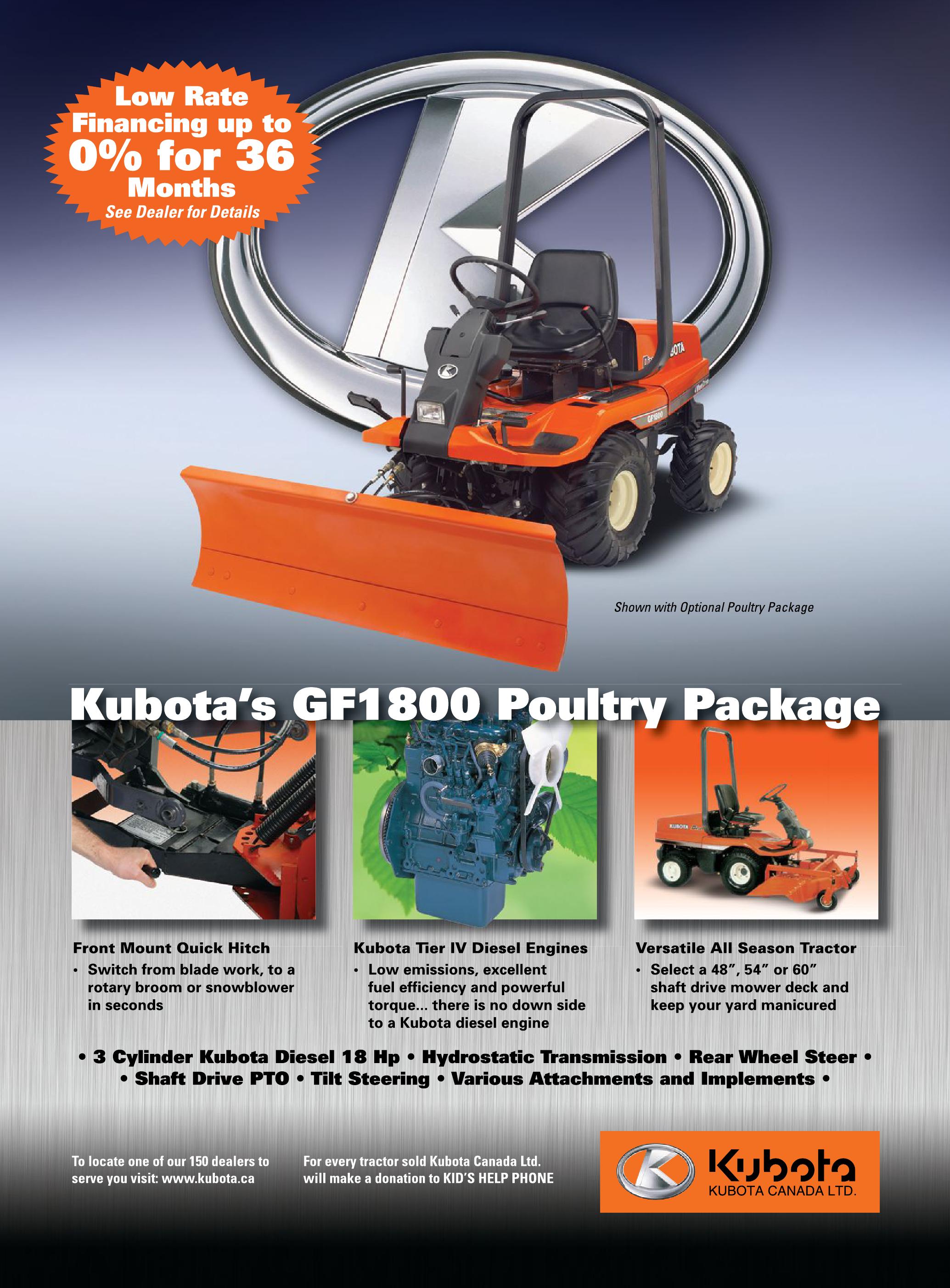kubOtA cANADA ltD. - Kubota Canada Ltd. celebrated 35 years of success and pride of ownership in the Canadian marketplace as a leading distributor of compact diesel tractors & construction equipment. As the only major competitor in Canada with a head office and three distribution centres, Kubota feels connected with our customer base, their needs and providing innovative equipment solutions. Reporting directly to Japan, Kubota Canada Ltd enjoys the product support and financial stability of belonging to the Kubota Corporation, founded 120 years ago. Kubota Canada’s strongest attribute is the dealer network, 150 authorized, dedicated locations across Canada. To become a proud customer and experience the Kubota difference visit www.kubota.ca to find your local dealer.