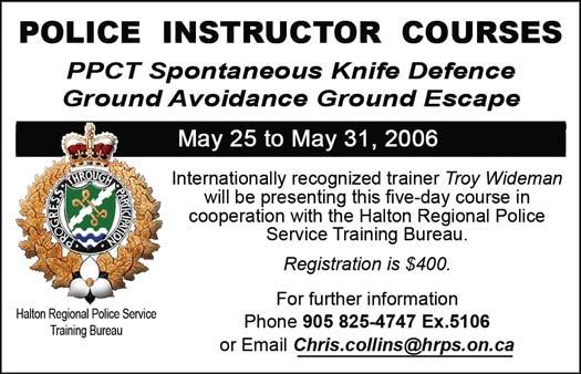 Hosted by the Halton Regional Police Service Training Bureau, the knife defence course is designed for police and correctional officers to raise awareness of strategies and use of techniques. GAGE is a self defense training program for those who have to confront and arrest violent offenders in close quarters. Fee is $400. Contact: Sgt Chris Collins, 905 825 4747 x5106 or chris.collins@hrps.on.ca .