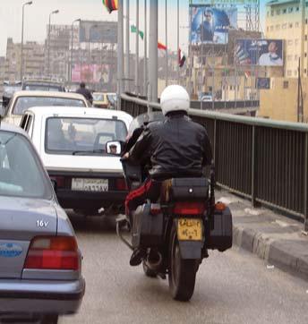 mon to most North American and European cities, doesn’t exist in Egypt. Rather, a system of static posts ensures a police presence at regular intervals and at major venues, particularly those frequented by tourists and foreign residents. Because police are predominantly on foot, they are highly visible and easily accessible. Finding a newer-model police vehicle in Egypt was difficult, but I did notice a few. Given the congestion and driving habits, especially in Cairo, older vehicles are perhaps a wiser investment. Most are older-model Toyota or Nissan pick-ups – some with canopies on the back.
