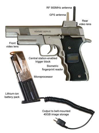 An onboard miniature camera records two minutes of video, both front and rear, and kicks in as soon as the pistol is drawn. A constantly-activated buffer memory transmits directly to a 40GB image storage device on the officer’s belt.