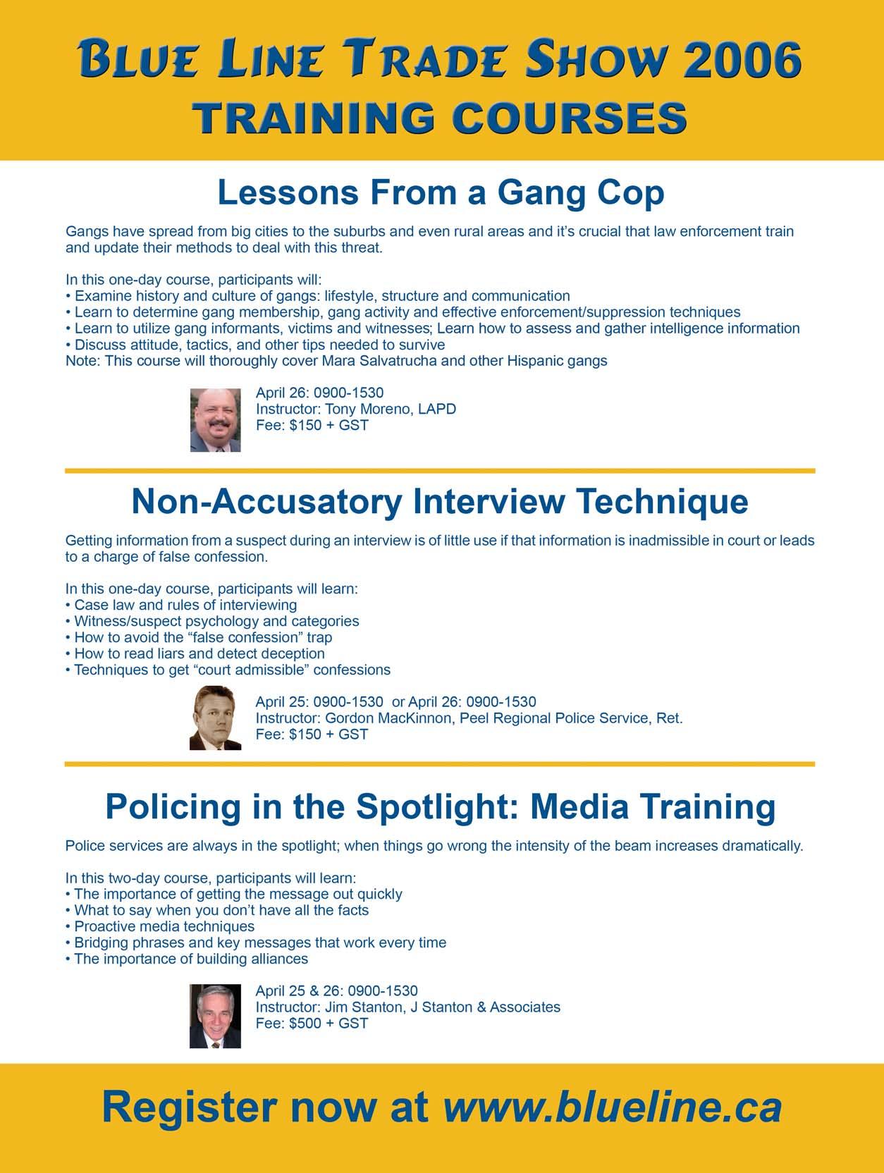 This one-day course by instructor Gordon MacKinnon, will draw on case law and rules of interviewing, witness psychology, teach how to detect deception and use techniques to get court admissible confessions. Course details and registration at www.blueline.ca .