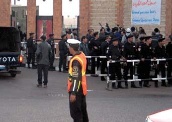 This show of force is softened somewhat by police efforts to go beyond the call of duty. After noticing the police crowd-control unit while passing the stadium by taxi, I had signaled my driver to stop. Finding myself on the wrong side of eight lanes of busy traffic, I was forced to use my recently acquired roadcrossing “skills.” With a bit of luck and the help of a rare break in traffic, I made my way across four lanes to the median – close enough to take several photos. Turning around to return, I was again faced with four lanes of traffic – this time facing an almost endless stream of vehicles, and waiting for what seemed like several minutes trying to cross. Seeing my dilemma, a traf-