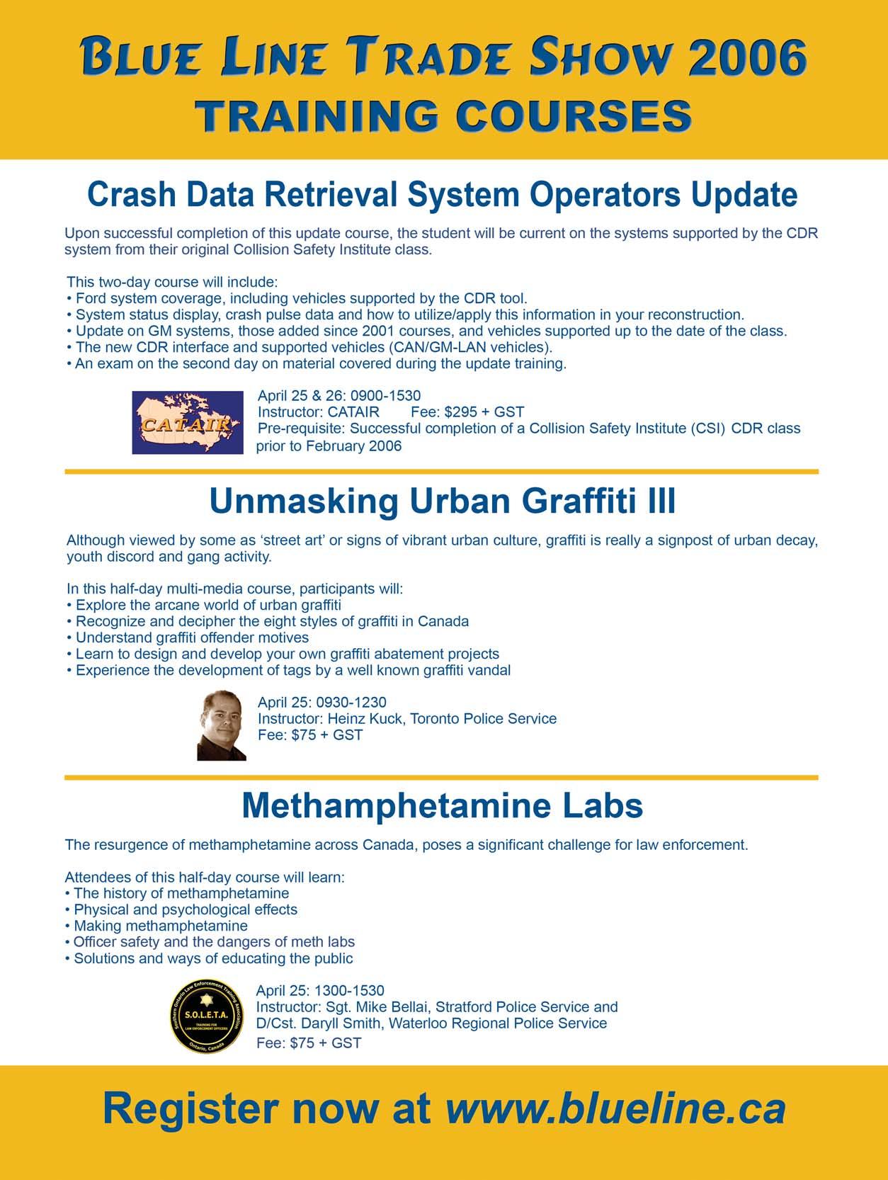 This half-day afternoon course instructed by SOLETA members will help you learn about meth. ingredients, how labs are set up, how to recognize indicators of lab activity, patrol issues related to shoplifting and officer safety when dismantling labs. Course details and registration at www.blueline.ca .