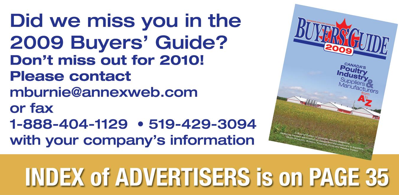 Although Canadian Poultry Magazine makes every effort to ensure the accuracy of information contained in this publication, it must rely on others over whom it has no control for certain information. The reader and/or advertiser acknowledges that Canadian Poultry Magazine and its publishers cannot and do not guarantee or warrant that the information in the Canadian Poultry Buyers’ Guide Directory is complete, correct or current.