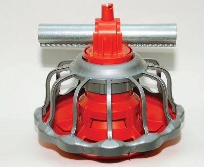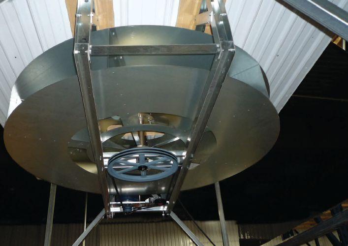 The Hemisphere Mixing Fan features a large diameter rotor with radial paddles housed in a steel frame and is mounted to the ceiling of poultry houses. It draws air from the center of the rotor and propels it outwards. This action draws air from below to provide vertical mixing and distributes the air throughout the house.
