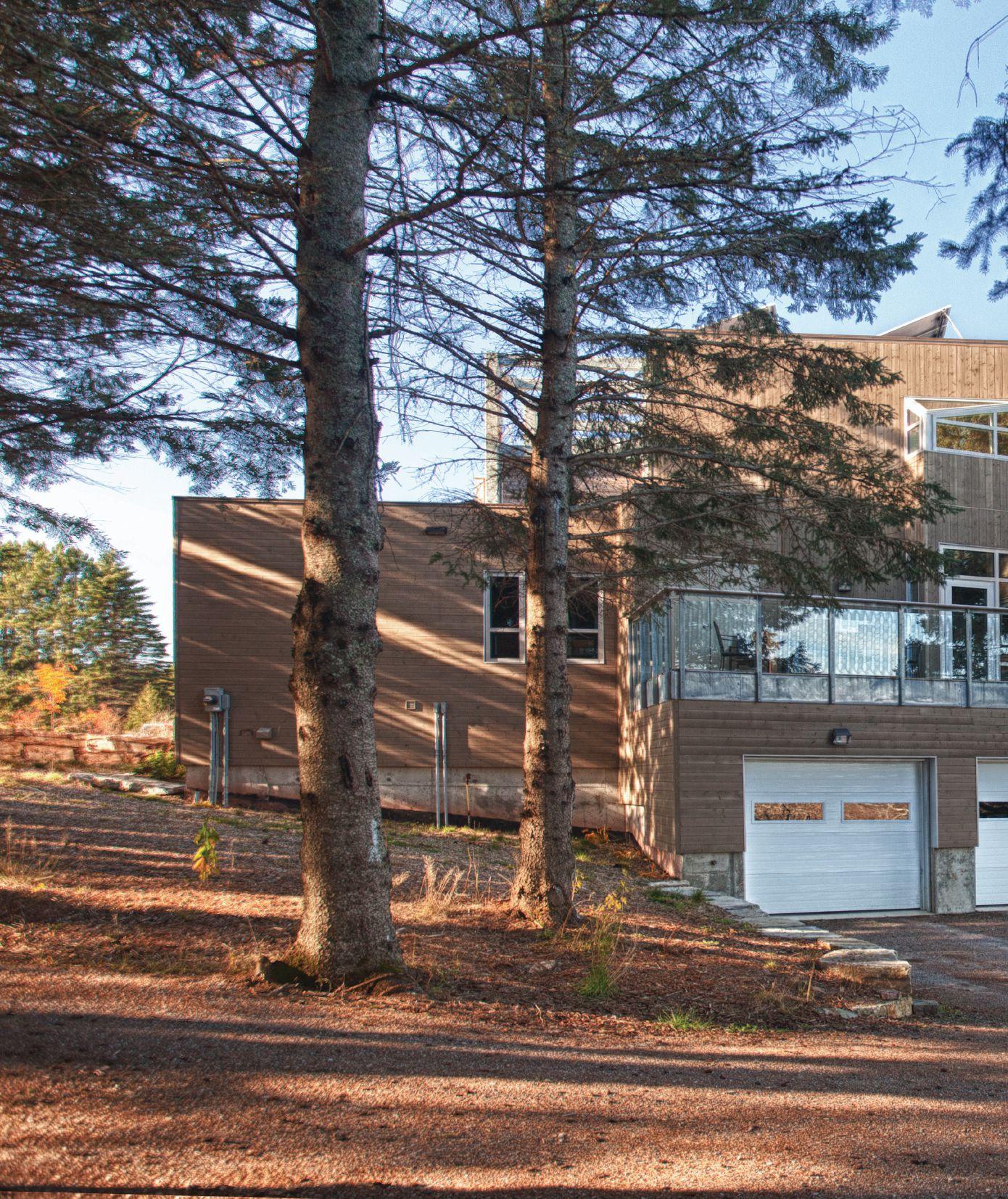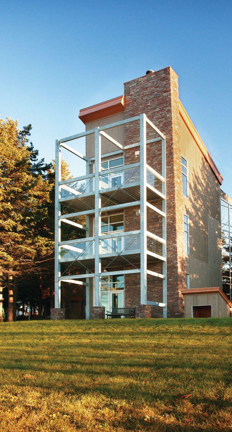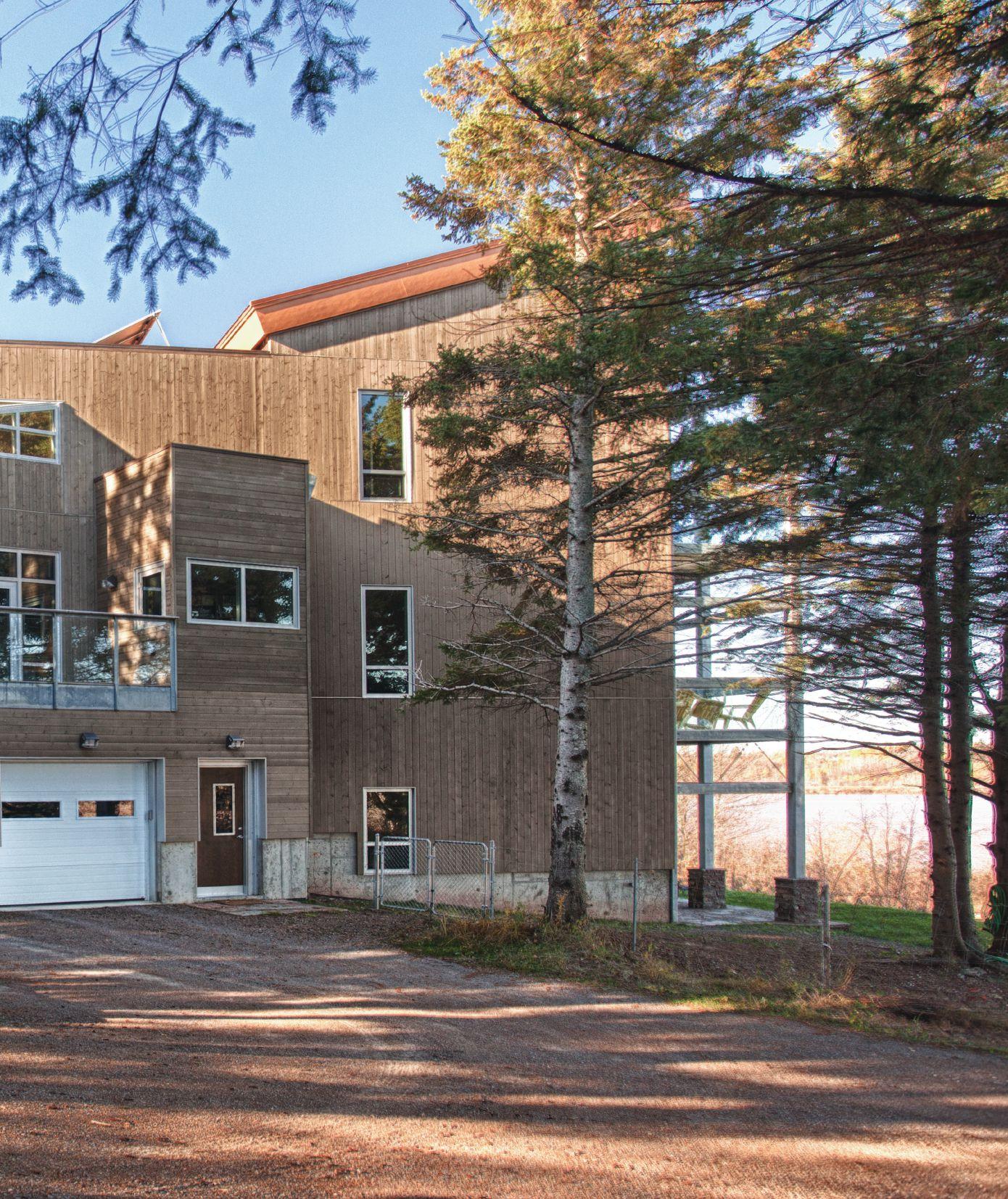 Architect Pierre Gallant’s clients gave him specific requirements for their new home beside the Petitcodiac River southwest of Moncton. Most critically, they wished to “work with” the existing topography of the private riverside site, taking advantage of the views, integrating the slope, and saving the mature grove of spruce trees. They feared a traditional development approach would destroy the trees and require considerable fill to build a suitable house pad.