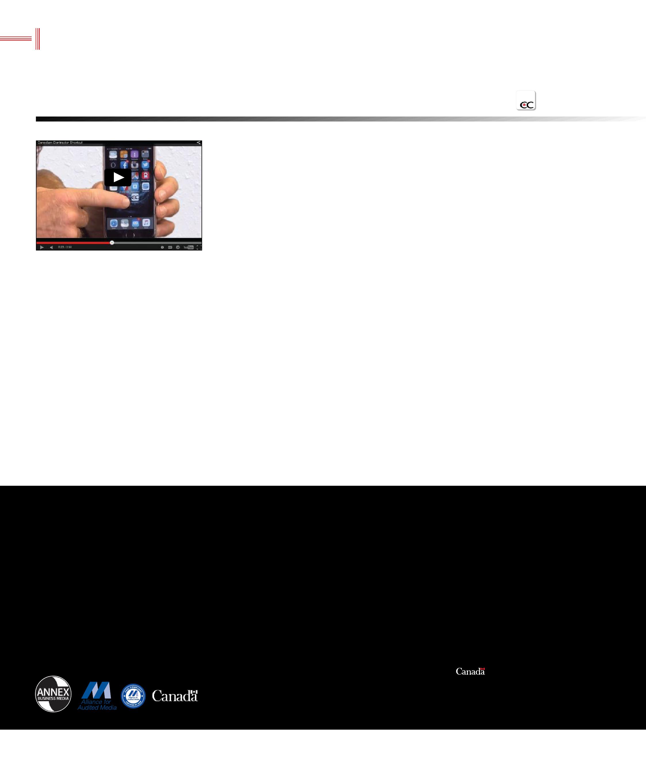 Canadian Contractor, established in 2000, is published 6 times a year by Annex Business Media. PUBLICATION MAIL AGREEMENT #40065710