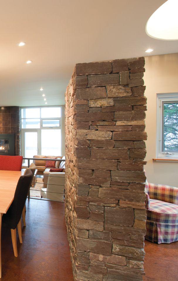 LEFT: A three level working wood fireplace, faced with Hillsborough sandstone quarried only a few miles away, continues to the north side exterior wall. Cork flooring was selected for most living space areas. There were issues beyond heating issues. There were the clients’ dogs. “They were sliding and trying to maintain their footing,” says Gallant. “There was wear-and-tear because of it.”