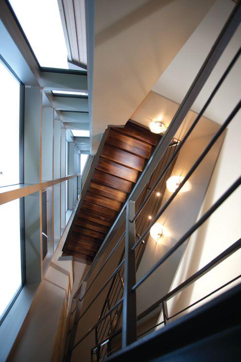 LEFT: The central staircase treads are rich cherry wood, which provide a striking contrast to the metal runners framing railings.