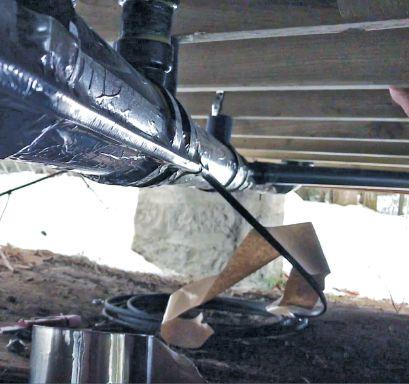 So how do you make sure drain lines never freeze when you don’t have enough soil? It comes down to electric heating cables and there are two options: external and internal. Until recently, external was the only choice for drains because plumbing codes prohibit any electric cable from being located inside a drain pipe. The danger that code authorities are concerned about is the remote chance of an explosion caused by a spark surrounded by volatile sewer gases. External application of heating cable also side- steps the chance of pipe blockage caused by sewage debris grabbing onto an internal cable and building up, but there are factors to be considered when installing an external cable. Besides the fact that the external approach is difficult to install around buried drain pipes, the transfer of heat to frozen water is inhibited by the pipe wall.