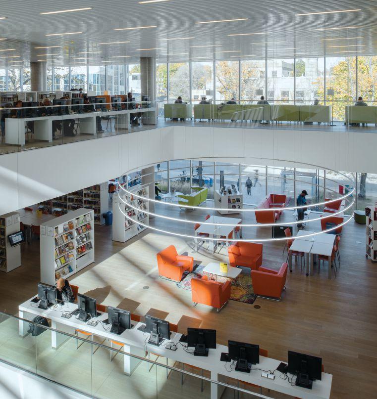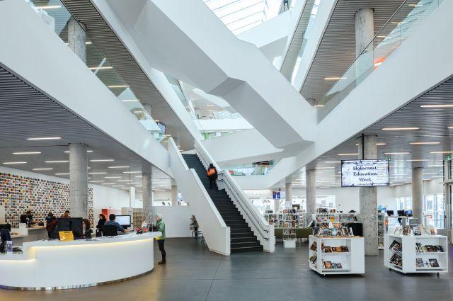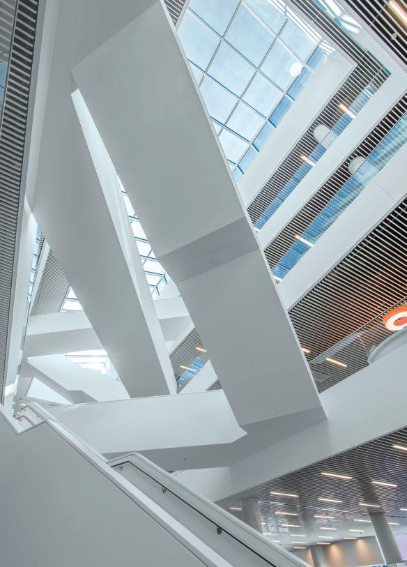 A centerpiece of the Capital District, the exterior was designed to mimic a stack of books. Built to LEED Gold standards, this 11,000 square-metre structure uses sustainable practices throughout. The five storey atrium consists of a labyrinth of stairs and bridges connecting the floors. Due to the high level of natural light and glass façade, a Level V finish throughout the building was imperative in order to showcase the sharp lines and world class design.
