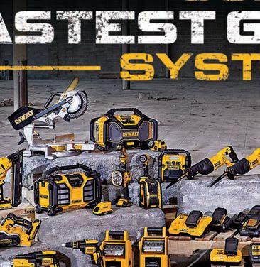 DeWalt’s rugged jobsite sound system, the TSTAK Radio + Charger, featuring a USB charger and AUX port, and a large storage and battery compartment.