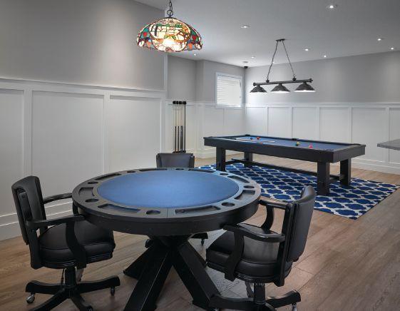 The client’s requirement for what they called “friendly entertaining space” carried into the interior. This was achieved with a large great room concept incorporating the main seating and dining areas and large kitchen. On the same level is a spacious master bedroom with an ensuite, large walk-in closet, and laundry room. A private den is located just off the main entrance. A triple garage with oversized doors also houses a complete workshop. Below grade, generous space is allotted for a games room, wine storage and tasting, a home theatre, plus a guest suite and a home control/utility room.