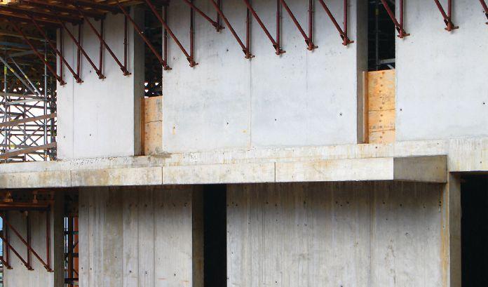 Above several windows the architects incorporated concrete “brows” that overhang a short distance similar to a sunshade. For these small cantilevers, the design team specified Isokorb concreteto-concrete thermal breaks for slab edges. The stainless steel rebar penetrating the insulation block ties into the interior slab rebar. On the exterior side, the rebar forms into a loop to support the small cantilever. The fourth Isokorb thermal break used connects concrete to steel at the steel balcony that cantilevers from the concrete structure over the entry area. The stainless steel rebar on the interior side of the module is wired into the floor slab rebar. Once cast in concrete, the exterior threaded side of each rod is bolted to steel balcony beams using backing plates and high-strength stainless steel nuts.