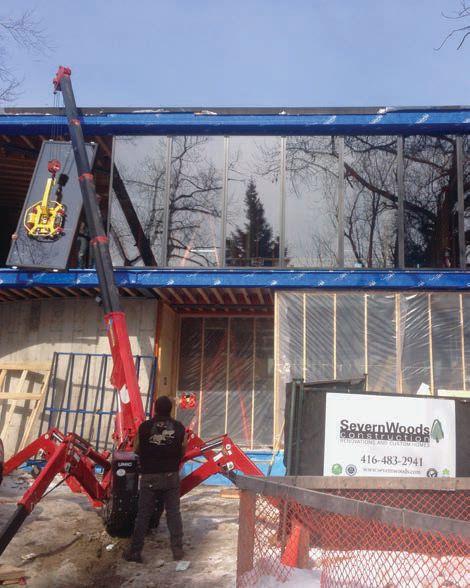 Each window is 11 feet tall and weighs over 550 lbs. A spider crane was used to move each panel off the truck and move it precisely into position.
