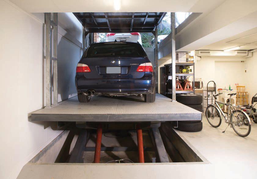 underground garage holds five cars by dropping each one down to the basement from the double garage above, for a total parking capacity of seven cars.
