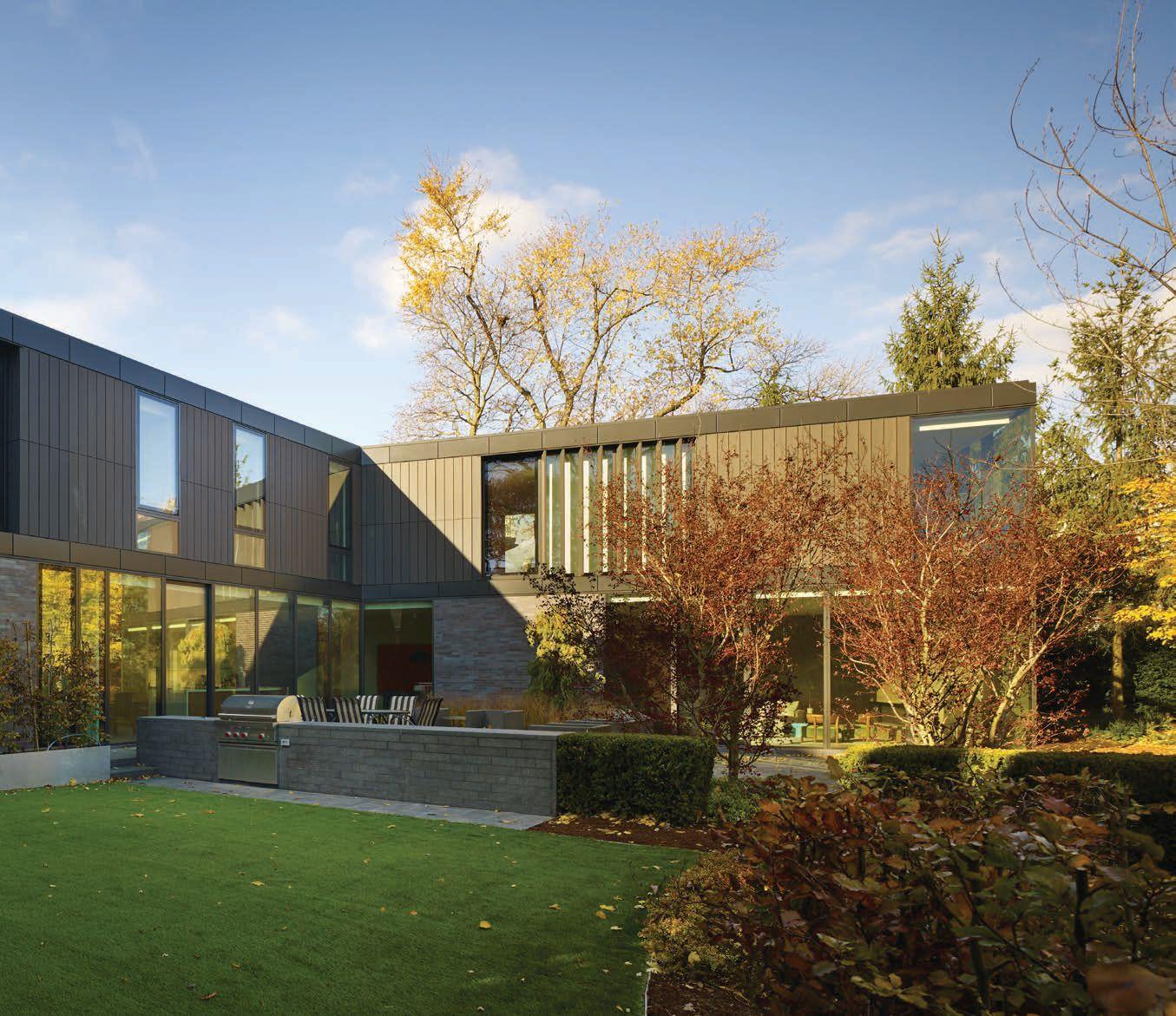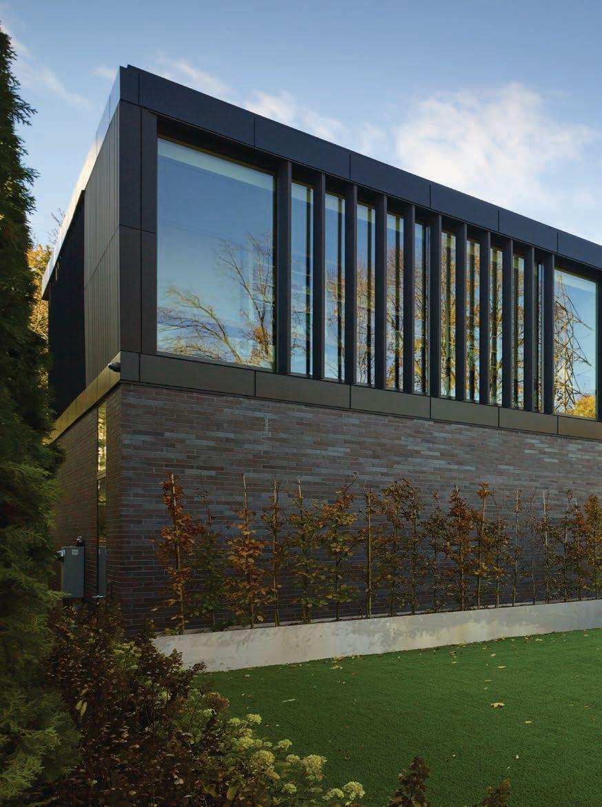The monochromatic exterior gains visual elegance from the mixed use of tinted glass panels, formed aluminum, iron spot brick and extruded terracotta.