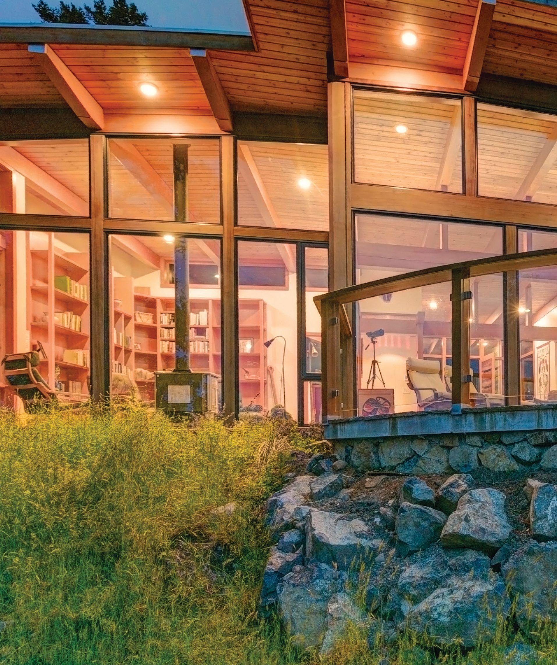 The site itself was also fortunate in many ways with respect to the province’s seismic design considerations. “The rock had been glaciated, ground and rounded, but it was solid,” said Helliwell. “We had a topographic survey done, determined the most naturally level platform, and then blasted the top off the outcrop and levelled the broken rock. It’s basically a slab-on-grade house built on top of that broken rock.” Although unseen to the eye, all seismic requirements were therefore accommodated by the foundation connections, occasional solid-paneled walls and the roof design. Helliwell said that the curved building itself is also stronger than a straight line design.
