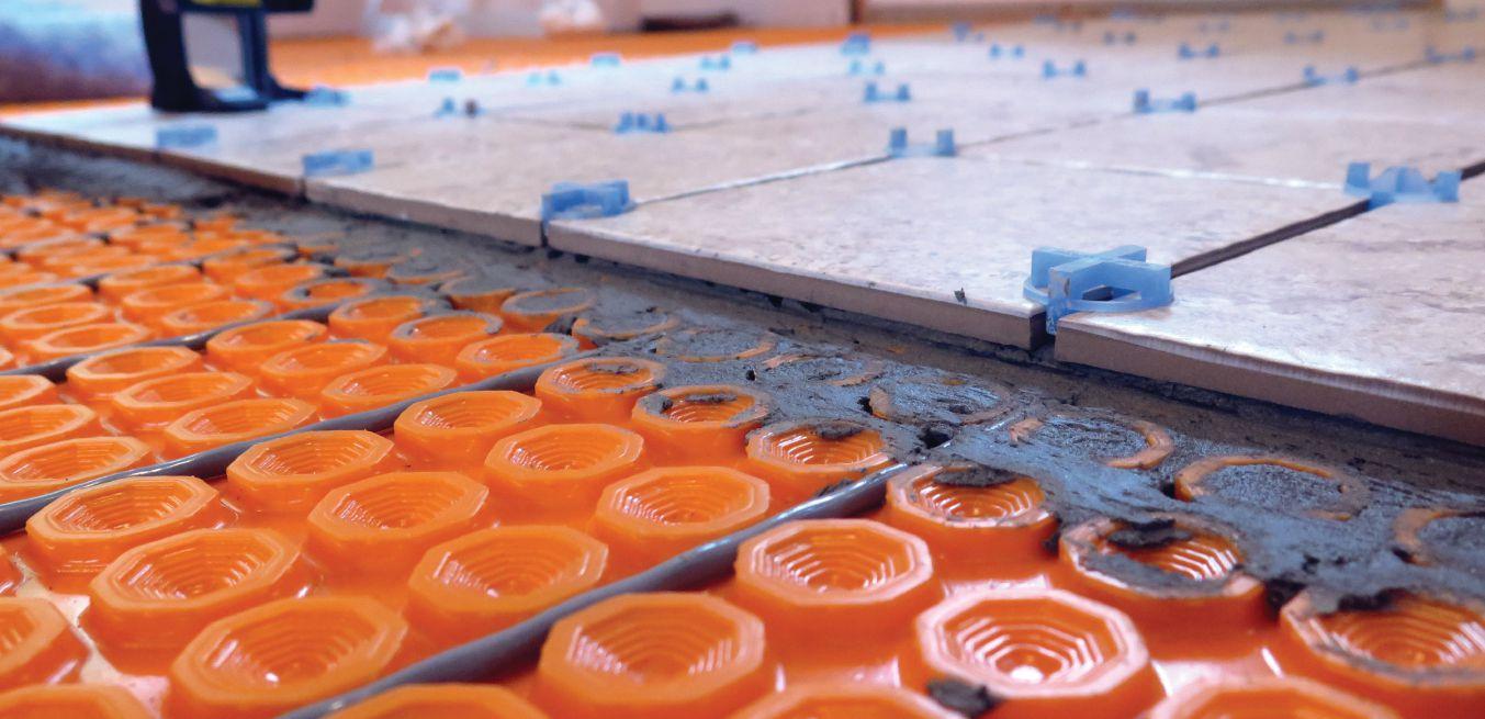 DITRA-HEAT is the easiest to install and best-warranted cablestyle electric in-floor system I’ve worked with. I’ve never had DITRA-HEAT let me down. The system includes a dimpled plastic underlay that’s made for heating cables to snap in only where you need it. Anchor the special DITRA underlay to the floor with thinset mortar, pop the cable in place from a spool around cabinets, appliances and other areas that need no heat, then cap the whole thing off with more thinset and tiles. A time-of-day thermostat allows your clients to pay only for the heat they need, and independent control of floor temperature lets them dial in just the right amount of floor heat relative to room temperature.