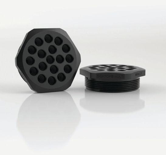 gel technology’s innovative membrane seal. Simply push in the cable, it adds, and the gel will hold the cable in place while providing optimal strain relief for the entire cable bundle. The gel does not apply stress to the installed cable, and unused entry points remain sealed. Operating temperature with or without an O-ring is -30° to 100°C. Protection class is IP68 -UL-approval pending. Applications include switch cabinet-, controls- and apparatus construction as well as automated machinery.