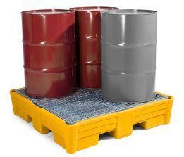 caustics, and other corrosive liquids. Each spill pallet holds up to four 55-gallon drums, and features an innovative design that distributes weight onto load-bearing channels to optimize capacity. Supports integrated into the sump’s base allow the secure installation of poly or galvanized grates; they are also available with no grates, as a standard wooden pallet fits on top of the containment pallet. The completely sealed, seamlessly processed poly sumps are 100-per-cent liquid-tight, and undergo thorough testing to guarantee leakproof operation. Built-in forklift pockets facilitate the secure transportation and loading from all four sides with drum lifters, pallet trucks, and forklifts. Sumps have a capacity of 66 gallons which adheres to EPA, OSHA, NFPA, UFC, and other standards, regulations, and guidelines. DENIOS Spill Containment Pallets are ideal for the storage of water-polluting, flammable substances, such as oils and lacquers, and other materials where spills could harm employees or the environment. All DENIOS Poly Spill Containment Pallets are made in the US and stocked in DENIOS’ Louisville factory for immediate availability.