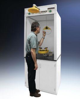 The Safety Station from HEMCO is a multi-purpose drench shower, eye/ face wash and safety supply storage cabinet all in one. It is suitable for laboratories where persons may be exposed to potentially hazardous chemicals. Sanitary white polypro construction means there is no wood or metal to rot or rust. The unit is equipped with a pull rod activated shower and push handle eye/ face wash for quick rinsing of eyes, face and body. Towels and first aid supplies can be stored in the cabinet below. Units available in 24, 30 or 36 in. wide x 24 in. deep and 84 in. high variations and are fully assembled and ready for installation to water supply.