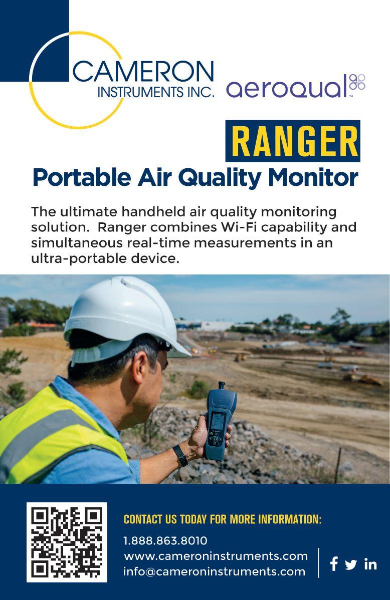 The Aeroqual Ranger available from Cameron Instruments is a re al time, battery operated, ac tive sampling handheld air quality monitor. A simple, flexible, and cost effective alternative to tradi tional air quality monitors, the company says, the unit can be con figured with a wide range of easily swappable sensor heads for partic ulate matter (PM) and 28 common indoor and outdoor hazards and pollutants. Wi Fi connectivity and cable data transfer enables users to understand conditions at a job site. All logged data is backed up on the Ranger Cloud service, in re al time, wherever Wi Fi is avail able. Users can sign up to receive automatic alerts and react to un