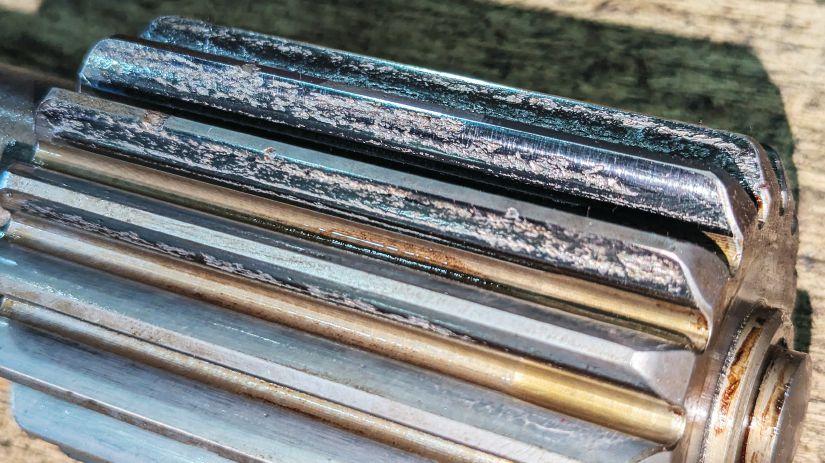 2: A fractured gear tooth. This fracture most likely started as a fatigue crack along roughly half of the tooth, before causing the entire tooth to break off due to brittle fracture