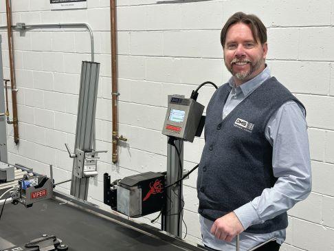 DMS Marquage Codage sales representative Patrick Gray standing next to the Squid Ink’s Co-Pilot Max Long Throw inkjet case-coder.