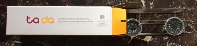 The whimsically-named ta-da large multipurpose shelf from Jascor Housewares Inc. of Dollard-des-Ormeaux, Que. comes in a clean and simple whiteand orange paperboard carton that aptly reflects the simplicity of the product