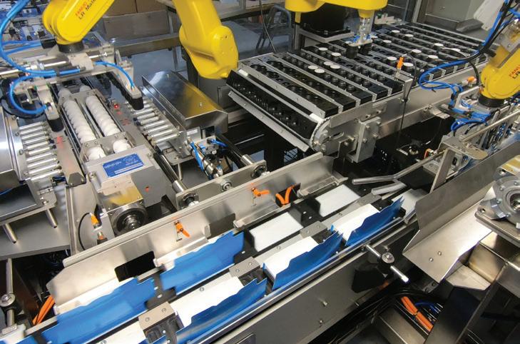 fully enclosed NTP-30 tray-packer with full vision inspection capabilities for both the products and that package. Optimally designed for coffee production environments and other applications requiring effective protection from high dust build-ups, the NTP-30 tray-packer forms, loads, and seals trays/cartons all in a single stainless-steel frame with full-coverage polycarbonate enclosure to maintain interior cleanliness of the workcell. Equipped with interior LED lighting to allow for optimal ease-of-operation and machine maintenance, this highperformance tray-packer employs three high-speed FANUC pick-and-place robots to pack up to 33 trays/cartons per minute—the equivalent of 330 packaged Nespresso -compatible instant beverage capsules. The NTP-30 tray-packer has numerous value-added validation features incorporated into the system—including cameras, a reject station and a barcode reader—to ensure the placement of the right flavor of the product into the right cartons or trays. The system’s Omron color cameras are responsible for identifying and confirming layer patterns inside the tray/ carton, as well as confirming that only the correct capsules are going into the tray/carton, with incorrect capsules rejected and set aside for later reuse. The capsule flavor is identified via capsule color, while each individual tray/carton is identified via both color and the affixed barcode, with all the changeovers between different flavors easily performed on the system’s user-friendly, recipe-controlled HMI (human-machine interface) terminal. Two robots in conjunction with a nested conveyor create the unique layer pattern on this particular machine, comprising eight inverted capsules with two upright nested capsules, for a total of 10 capsules per layer. The machine utilizes a third robot to load 10-, 20- or 30count cartons placing a layer pad/sheet in between the 10-capsule layers. Nuspark Inc.