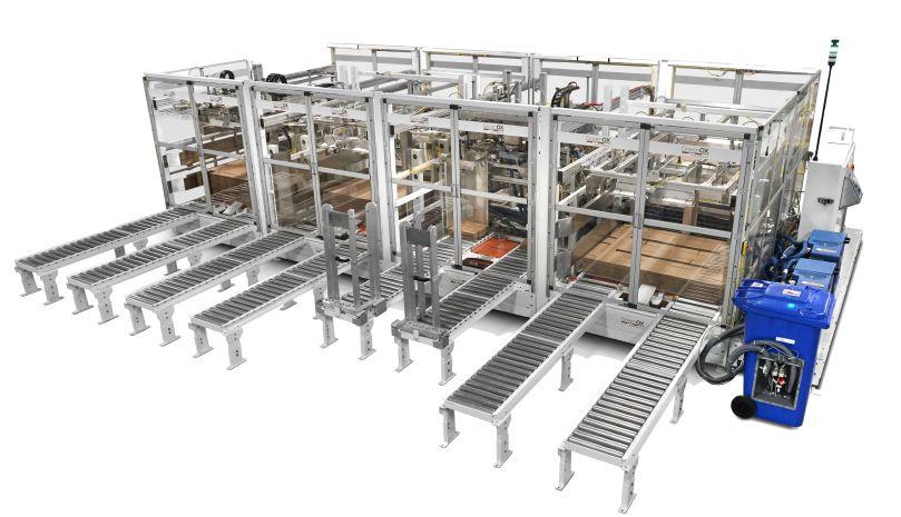 The simple and modular ~650-square-foot pallet assembly machine, which features up to four stations, assembles 200- to 250-corrugated pallets per hour and offers real-time assembly for immediate use in the supply chain with end-of-line packaging functionality. Each station is loaded with corrugated blanks that are