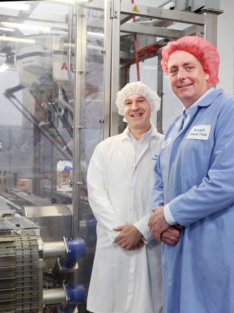 Riverside Natural Foods president Nima Fotovat (left) and Propack president Chris Follows share a laugh with some finished retail packages of the MadeGood granola product.