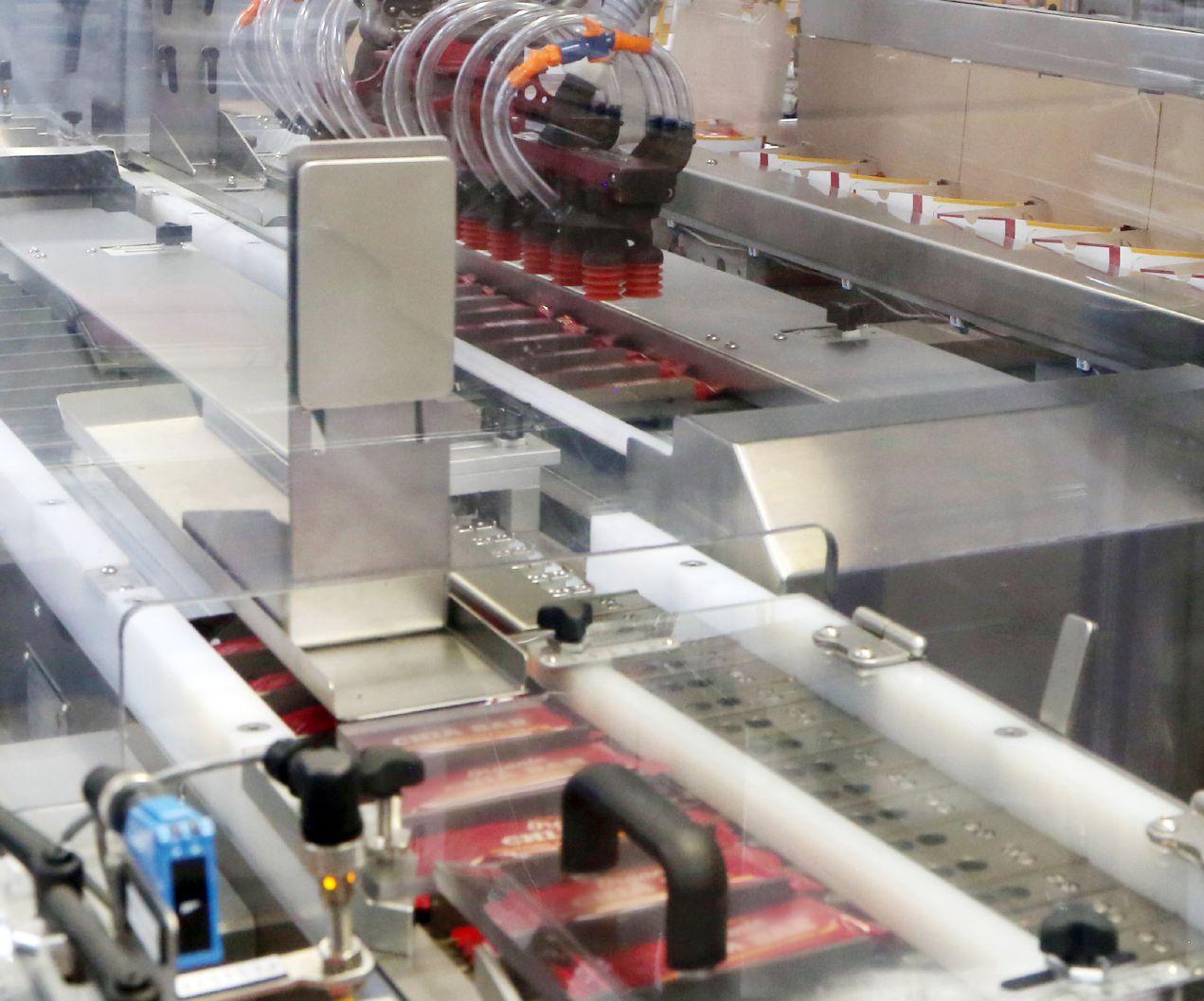To close the loaded cartons, the plant employs a Bosch Kliklok Vari-Right carton closer that steadies the opentop cartons, folds the flaps to close the carton, and activates the Nordson ProBlue hot-melt adhesive applicating system to fully seal each box before it’s placed on a pallet.